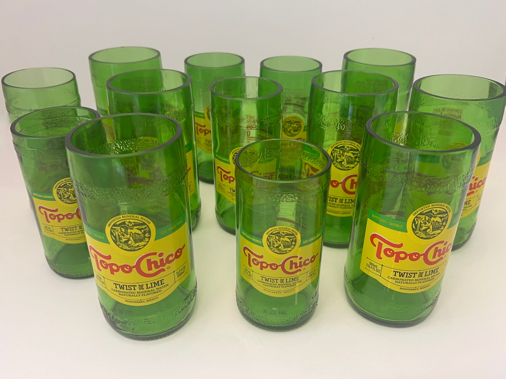 Beyond Ordinary Hydration: Transform your drinking experience with these artisanal Topo Chico glasses. Each one tells a story of skilled hands and a dedication to quality. Iconic Topo Chico bottles are upcycled into these trending drinking glasses. This green drinkware may come in original or XL sizes. Handmade in USA.